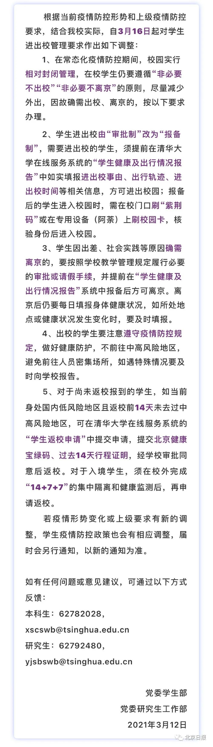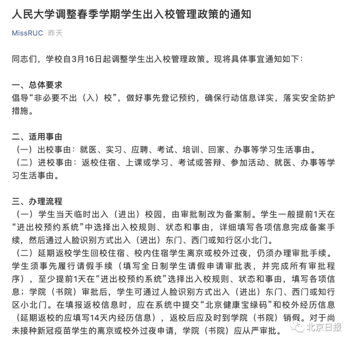 清华、人大调整出入校规定!多所在京高校学生3月16日起集中返校