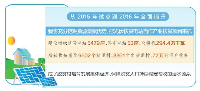从2015年试点,到2016年全面铺开,我省充分挖掘资源禀赋优势,把光伏扶贫电站当作产业扶贫项目来抓,建设村级扶贫电站5479座、集中电站53座,总装机294.4万千瓦,所获收益惠及6602个贫困村、3361个非贫困村,72万贫困户受益,成了脱贫村培育发展集体经济、保障脱贫人口持续稳定增收的活水源泉。