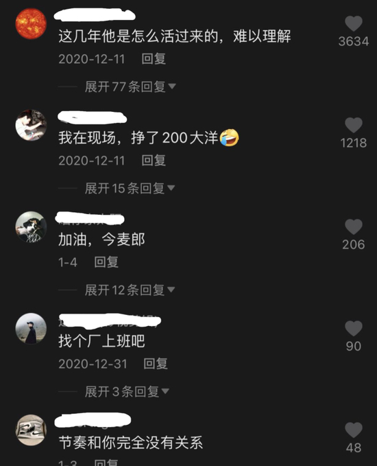 演出视频被上传到抖音,天南海北的路人留下评论。有人劝他“找个厂上班吧”,有人不信庞麦郎也能有听众:“贴了多少钱给观众?”“我在现场,挣了200大洋。”