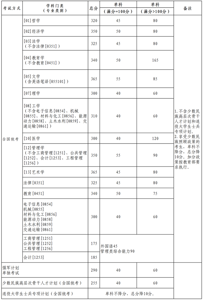 *享受加分政策考生:参加“大学生志愿服务西部计划”“三支一扶计划”“农村义务教育阶段学校教师特设岗位计划”“赴外汉语教师志愿者”等项目服务期满、考核合格的考生,3年内参加全国硕士研究生招生考试的,初试总分加10分,同等条件下优先录取。高校学生应征入伍服现役退役,达到报考条件后,3年内参加全国硕士研究生招生考试的考生,初试总分加10分,同等条件下优先录取。参加“选聘高校毕业生到村任职”项目服务期满、考核称职以上的考生,3年内参加全国硕士研究生招生考试的,初试总分加10分,同等条件下优先录取,其中报考人文社科类专业研究生的,初试总分加15分。加分项目不累计,同时满足两项以上加分条件的考生按最高项加分。