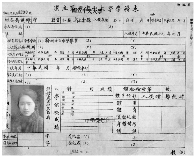 吴健雄在国立中央大学读书时的学籍表