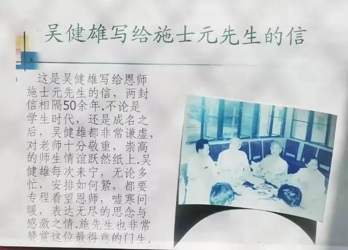 1933年,吴健雄升入大学四年级,施士元教授是其近代物理课老师。施士元曾于1929-1933年在法国巴黎大学镭研究所从事研究工作,是诺贝尔奖获得者居里夫人为中国培养的唯一的物理学博士。施先生曾这样回忆:吴健雄不多言语,待人温和,秉性喜静,爱好读书,兴趣广泛,写一手刚健秀丽的书法,刻苦勤奋又特别喜欢做实验。像居里夫人对待自己一样,施先生对这位聪慧的学生给予了更多的关怀。在教学、科研和毕业论文写作中,师生俩结下了深厚的情谊。成名之后,吴健雄曾说,把她带进物理学的关键人物是施士元教授,如果没有那时打下的扎实基础,后来的发展就无从谈起。