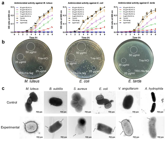 rELAVL1a的抗菌活性及其对细菌结构的影响。a:rELAVL1a抗菌活性的液体抑菌法检测;b:rELAVL1a抗菌活性的抑菌圈法检测;c:电子显微镜观察rELAVL1a对细菌的作用。