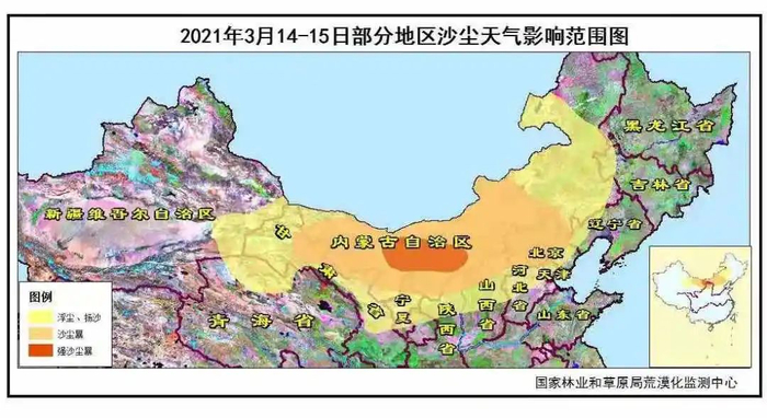 受冷空气和蒙古气旋共同作用的结果,我国新疆、内蒙、山西、陕甘宁、东北、京津冀等地区正经历来自蒙古国的沙尘天气,这是今年以来范围最大、强度最强的沙尘,沙尘核心区域PM10接近10000微克每立方米。目前沙尘已经开始影响北京,15日8时PM10全市平均达到1000微克每立方米以上,北部部分区域达到2000微克每立方米以上。
