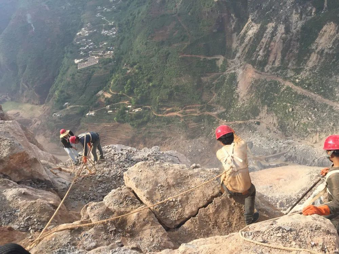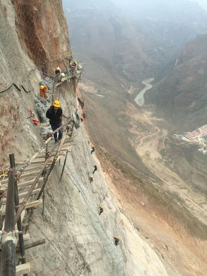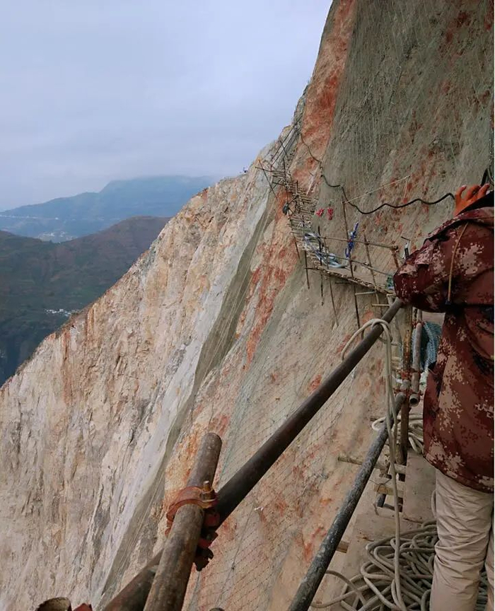 面对刀削一般的陡崖,大型机械毫无用武之地,只能依靠“蜘蛛人”——工人系上安全绳从崖顶下去,进行作业。直到“蜘蛛人”在岩壁上搭起栈道,才能上一些小型机械,施工进度由此快了起来。