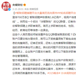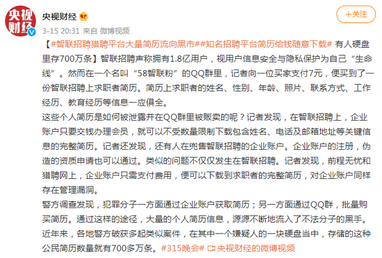 原标题:智联招聘猎聘平台大量简历流向黑市 知名招聘平台简历给钱随意下载