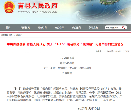 另据青县人民政府网站消息,“3·15”晚会曝光青县“瘦肉精”问题羊肉后,当晚9:30县委召开常委(扩大)会议,按照市委、市政府要求,迅速安排布置,组织由农业农村、市场监管、公安、新兴镇等单位100多人参加的联合执法队伍,以零容忍的态度,开展全面排查封控工作,依法严厉打击违法行为,严防问题羊肉流出县境。目前,相关嫌疑人回成杰、代峰已被控制,后续工作正在有序进行。