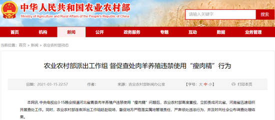 据农业农村部官网消息,中央电视台3·15晚会报道河北省青县肉羊养殖户违禁使用“瘦肉精”问题后,农业农村部高度重视,立即责成河北省、河南省迅速组织开展查处工作。同时,农业农村部连夜派出工作组赶赴现场,督促地方严格落实属地管理责任,严肃惩处违法行为,并及时向社会公布调查处理结果。