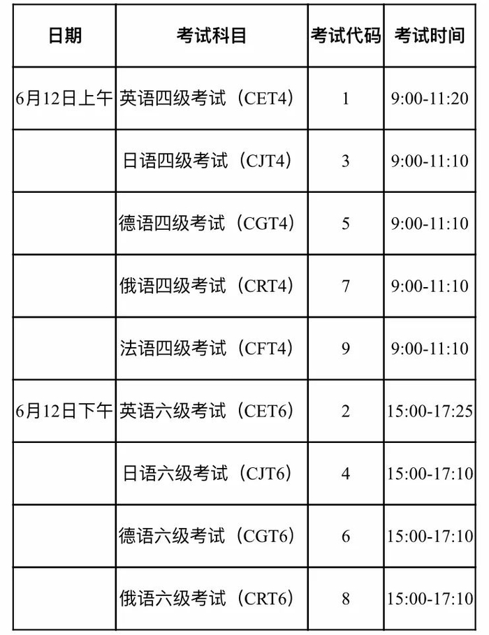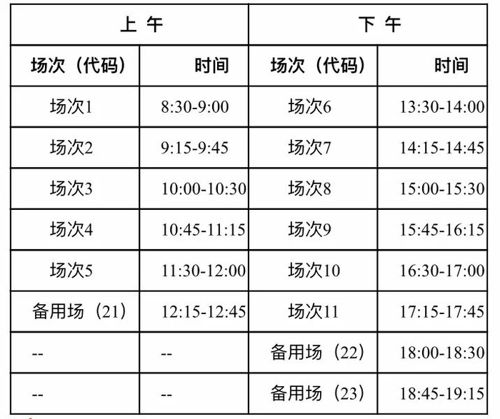 英语四级口语考试(CET-SET4)考试时间为5月22日(F211次),英语六级口语考试(CET-SET6)考试时间为5月23日(S212次),具体场次安排如下: