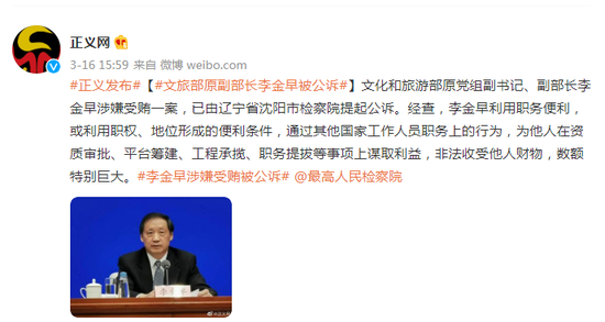 文化和旅游部原党组副书记、副部长李金早涉嫌受贿一案,已由辽宁省沈阳市检察院提起公诉。经查,李金早利用职务便利,或利用职权、地位形成的便利条件,通过其他国家工作人员职务上的行为,为他人在资质审批、平台筹建、工程承揽、职务提拔等事项上谋取利益,非法收受他人财物,数额特别巨大。