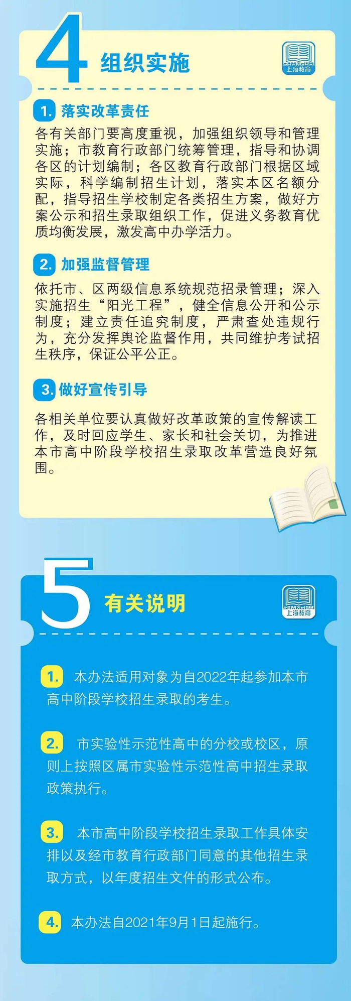 《实施办法》全文可通过“上海教育”网站(http://edu.sh.gov.cn)和“上海教育”政务微信(SHMEC-xwb)查阅。近期市教委将通过报刊、广播电视、网站、微博、微信等途径,做好相关政策的宣传解读。同时,各区指导相关学校原则上在文件发布后两周内,召开相关年级学生家长会。后续本市还将出台有关优秀体育学生和艺术骨干学生招生方案、高中学校综合考查指导意见、2022年度中招实施办法等相关配套文件。