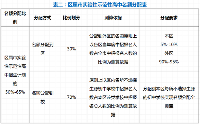 二是区属市实验性示范性高中的名额分配招生计划占其招生计划总数的50-65%,其中,分配到区招生计划约占本校名额分配招生计划的30%,分配到校招生计划约占本校名额分配招生计划的70%。各区属市实验性示范性高中的名额分配到校招生计划,原则上以所属区内各所不选择生源初中学校中招报名人数占本区该类学校中招报名总人数的比例为测算依据,分配到本区每所不选择生源的初中学校,实现名额分配全覆盖。文件指出,市实验性示范性高中的分校或校区,原则上按照区属市实验性示范性高中招生录取政策执行。