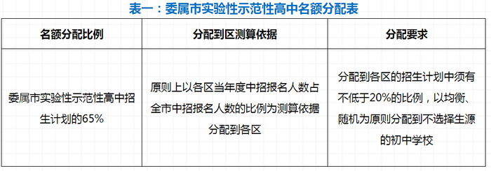 《实施办法》特别明确了名额分配的具体要求:一是委属市实验性示范性高中名额分配招生计划占其招生计划总数的65%,原则上以各区当年度中招报名人数占全市中招报名人数的比例为测算依据分配到各区,分配到各区的计划中须有不低于20%的比例以均衡、随机为原则分配到不选择生源的初中学校。