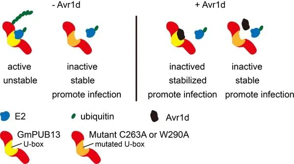 PsAvr1d是王源超教授团队鉴定到的一个大豆疫霉的无毒效应子,该效应子的突变可以导致大豆抗病基因Rps1d丧失对疫霉菌的抗性(Yin, et al., MPMI, 2013)。本研究中该团队发现在没有寄主大豆抗病基因存在的条件下,Avr1d能促进疫霉菌侵染。通过酵母筛库和生化实验证明,Avr1d与大豆的U-box类E3泛素连接酶GmPUB13互作。通过解析Avr1d与GmPUB13的U-box功能域的复合晶体结构发现,Avr1d能占据GmPUB13的U-box功能域。其中Avr1d上的第90位苯丙氨酸(F)对于Avr1d靶向GmPUB13和发挥毒性功能是必需的。进一步生化实验证明Avr1d通过竞争E2泛素结合酶与GmPUB13的互作区域(U-box)来抑制GmPUB13的泛素连接酶活性,并稳定GmPUB13蛋白,从而促进大豆疫霉侵染。该研究从全新的视角展示了病原菌效应子Avr1d如何“以小博大,精准打击”寄主免疫相关蛋白GmPUB13的机制,为认识大豆对病原菌抗性的分子机理提供了新的理论知识,也为通过基因修饰改造作物的免疫系统提供了重要的分子靶标。