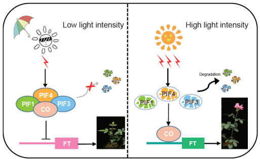 和光周期响应不同,月季对光强的应答却很敏感。团队前期发表在Plant Physiology的成果显示,当光周期条件一致(16h光照/8h黑暗)时,无论有没有远红光(EOD-FR)补充,弱光(92 μmol·m-2·s-1)下生长的月季比强光(278μmol·m-2·s-1)下开花时间延迟2周以上,株高和节间都明显降低。在弱光条件下,RcPIF1、RcPIF3、RcPIF4在蛋白水平和转录水平都出现明显积累。干扰RcPIFs基因后月季花期和株高得到不同程度的恢复。这几个RcPIFs既能两两进行蛋白互作,同时都能与RcCO互作,CoIP结果证明四者形成复合体。光照强度通过改变该复合体的稳定性调控RcFT的转录水平和开花(图3)。可见,RcPIFs在月季光强应答中扮演了关键角色,而RcCO发挥了重要的调节作用。所以,要实现月季的精准补光不仅要选择最佳的光照长度,还要统筹考虑光强和光质的综合作用。