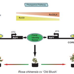 南京农业大学王长泉教授团队前期研究发现,月季是日中性植物,在光强满足的条件下,其开花时间对光周期相对不敏感。其中,RcCO在长日照条件下高表达并对月季开花发挥了主导作用,而RcCOL4则在短日照下高表达并发挥开花调控功能,且RcCOL4位于RcCO的上游。RcCOL4通过与RcCO蛋白互作促进RcCO与RcFT启动子上CORE元件的绑定,进而促进RcFT在短日照下表达,使得月季在短日照条件下也能开花,从而表现出光周期不敏感性(如图1所示)。该研究成果“Alternative expressions of RcCOL4 in short day and RcCO in long day facilitate day-neutral response in Rosa chinensis”发表在国际学术期刊Journal of Experimental Botany,法国农科院的Béatrice Denoyes教授对该成果进行了评述。