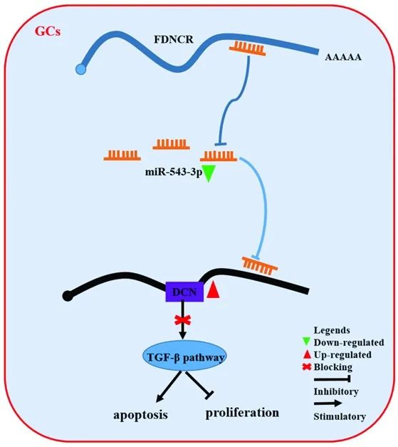 探究lncRNA和miRNA调控多胎湖羊卵泡发育的作用机制是当前肉羊繁育的研究热点。本团队首次将基因型与繁殖力精准配对,以不同基因型的高低繁湖羊卵巢为研究对象,采用RNA-Seq技术对其进行lncRNA测序,发现新转录本MSTRG.98424.7在FecB+低繁湖羊组中高表达,通过RACE技术发现该转录本总长为1631 nt,采用FISH技术发现主要定位于湖羊卵巢颗粒细胞中,且随着卵泡的增殖而降低。提示该转录本可能与卵泡发育有关,因此将其命名为FDNCR (Follicular development-associated lncRNA),进一步通过RIP、FISH等技术探索FDNCR-DCN轴、FDNCR-miR-543-3p轴、miR-543-3p-DCN轴的形成机制及功能验证,结果表明:lncRNA FDNCR通过吸附miR-543-3p,减弱miR-543-3p对DCN基因表达的抑制作用,进而增强DCN基因对TGF-β通路相关基因的抑制作用,最终促进湖羊颗粒细胞的凋亡,揭示了lncRNA FDNCR介导DCN/TGF-β通路参与多胎湖羊卵泡发育的调控机制。