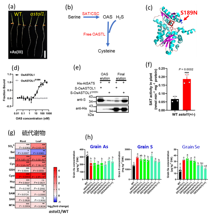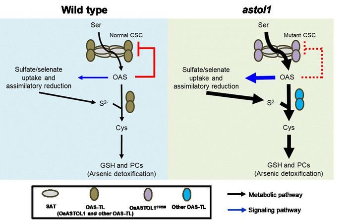 赵方杰团队通过正向遗传学的方法克隆到水稻耐砷突变体astol1的基因OsASTOL1。该基因编码一个定位于叶绿体的半胱氨酸合酶(OAS-TL),astol1突变体中该蛋白的第189位丝氨酸(S)突变为天冬酰胺(N)。一系列实验证明OsASTOL1S189N丧失了OAS-TL酶活性,但由于有其它同工酶的存在,并不影响半胱氨酸合成。与野生型相比,OsASTOL1S189N增强了与丝氨酸乙酰转移酶(SAT)形成的半胱氨酸合酶复合体(CSC)的稳定性,提高了水稻体内SAT酶活性,导致半胱氨酸合成的关键底物O-乙酰丝氨酸(OAS)积累,而OAS又是调控硫代谢的信号物质,从而正向调控硫和硒的吸收和同化,提高水稻体内硫和硒含量,同时增加硫代谢产物包括半胱氨酸、谷胱甘肽和植物螯合素的合成,增强水稻对砷的解毒能力,并使更多的砷截留在根部,最终造成水稻耐砷、稻米降砷富硒的表型。