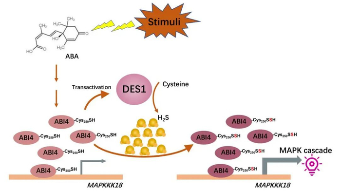 丝裂原活化蛋白激酶(MITOGEN-ACTIVATED PROTEIN KINASE, MAPK)级联系统是在真核生物中发现的保守信号通路,它们在环境和发育信号的传递中起重要作用,参与不同的细胞过程,如生长、发育和胁迫响应。遗传学和生物化学研究表明,MAPKKK18是ABI4调控的下游靶标。在ABA信号途径中,ABI4结合MAPKKK18启动子CE1原件,MAPKKK18转录受激活。ABI4-MAPKKK18的这一转录调控过程也受硫巯基化修饰调控。巯基化修饰能提高ABI4对MAPKKK18转录激活的能力,但并不影响ABI4对CE1原件的结合。同时巯基化修饰能提高ABI4对DES1转录激活能力。