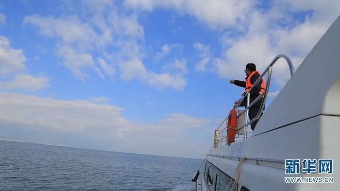 图为王欣泽在船上观察洱海水质。(新华网 丁凝/摄)