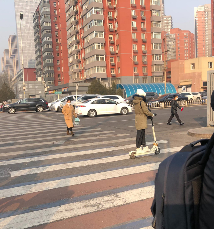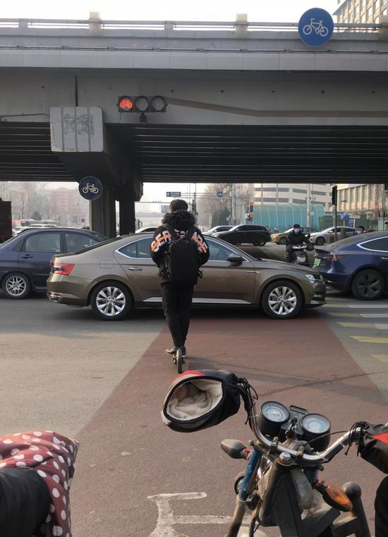 上午9点,地铁1号线大望路站周围正值早高峰,各类车辆川流不息,过往行人步履匆匆。忽然,一个独特的身影从大望桥下飞快闪出。她把双肩包挂在胸前,连帽衫将头捂得严严实实,两脚站立在一辆白色电动滑板车上,迅速沿着西大望路的非机动车道向北驶去,把身边的自行车骑行者远远甩在身后。