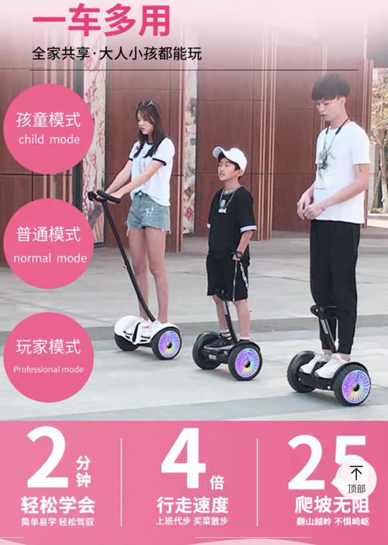 事实上,类似的画面经常可以在小区或街头看到,儿童正在成为电动平衡车的主要使用者。在电商平台上,电动平衡车更是被商家定义为“送给孩子成长的礼物”。
