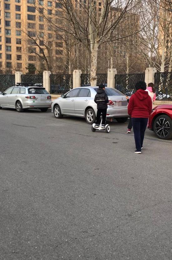 行至商场东侧的茂兴西路旁,男孩跳下电动平衡车,走下台阶后继续在马路上骑行。虽说此处停放着多排车辆,且随时可能有车辆进出,但男孩并未停下,依然在缝隙中穿梭。