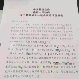 3月17日,网传一份情况报告显示,河北保定蠡县鲍墟镇齐家营村张某绿一家五口人被害,死者包括三代人,最小的2岁,最大的65岁。嫌疑人家庭住址与死者家相邻,在死者家被发现时已自杀身亡。