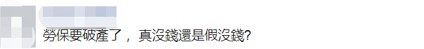 还有网友骂民进党当局:“打肿脸充胖子,真悲哀。”“劳保要破产了,真没钱还是假没钱?”↓
