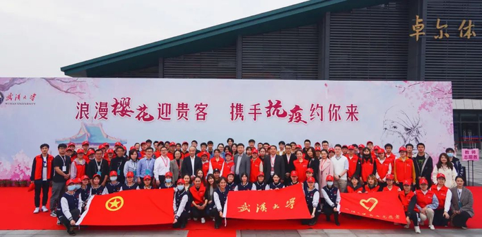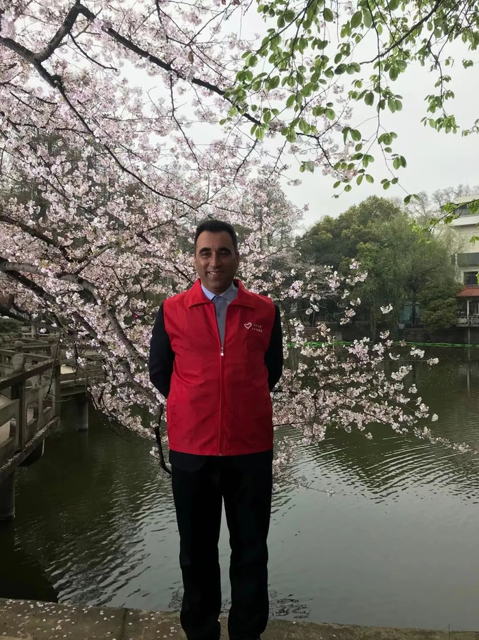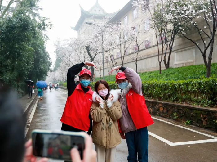 志愿者中,还有异国身影浮现。当问及为什么要做赏樱志愿者时,阿部老师不假思索道,“最美的花应当送给最美的人。”疫情期间,他与家人留汉隔离,亲眼见证白衣执甲、驱散病魔,心中满怀感激之情。因此当得知志愿者招募后,他毫不犹豫地报了名。“我要接他们来武大看樱花,希望也给他们一个很好的服务。”阿部老师的工作是带领医护家庭穿越校园最美的地方并合影留念。“他们很开心,一路上跟我聊天,是一个外国人带领他们看樱花!看见他们的笑容我也非常高兴。”感谢来自异国他乡的“阿部们”为游客送去温暖服务,春日校园里最美的,从来不止是花朵。