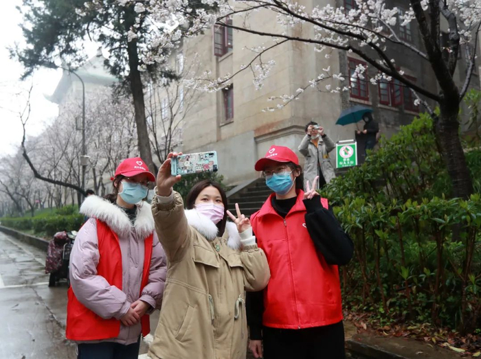 在幽静的杏园,一个寝室中的四名成员不约而同在志愿者招募中填上了自己的姓名。在樱花季,这四个姑娘主要负责协助保卫部在校园相应区域、路段、门口的出入管理工作,维护樱花密集区域的秩序。作为临床医学专业的学生,抗疫前线的医护人员大都是她们的师长,在疫情期间一边工作一边上网课,在教学过程中也会讲述抗疫事迹。而今,受到鼓舞的她们也用自己的方式将这种精神传承。“一线的医护战士们为全市的抗疫贡献了力量,正是因为他们心中坚守的使命感才让防疫工作正常进行并取得骄人的成绩”,她们如是说。