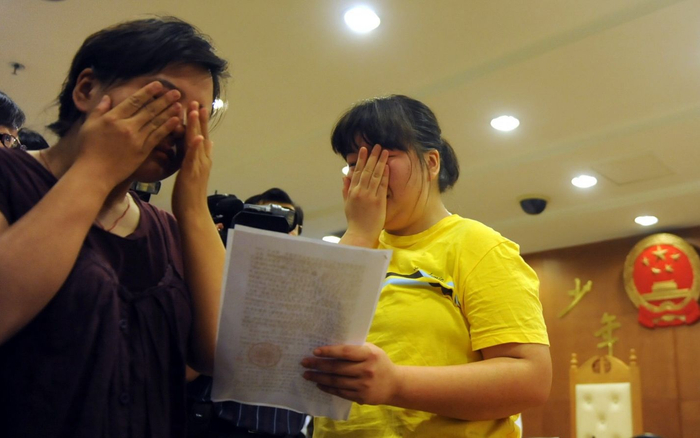 2009年6月18日上午,海淀法院少年法庭,刚刚获得缓刑的女孩和姐姐掩面而泣。当天是她的生日,法官以及她的家人在法庭现场为她举办了成人仪式,并庆祝18岁生日的到来。新京报记者 杨杰 摄