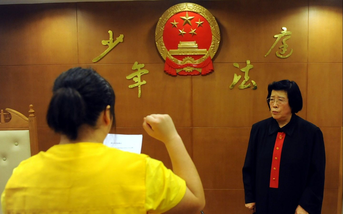 2009年6月18日上午,海淀法院少年法庭,刚刚获得缓刑的女孩在面向国徽和法官进行成人宣誓。随后,法官以及她的家人在法庭现场为她举办了成人仪式,并庆祝18岁生日的到来。 新京报记者 杨杰 摄