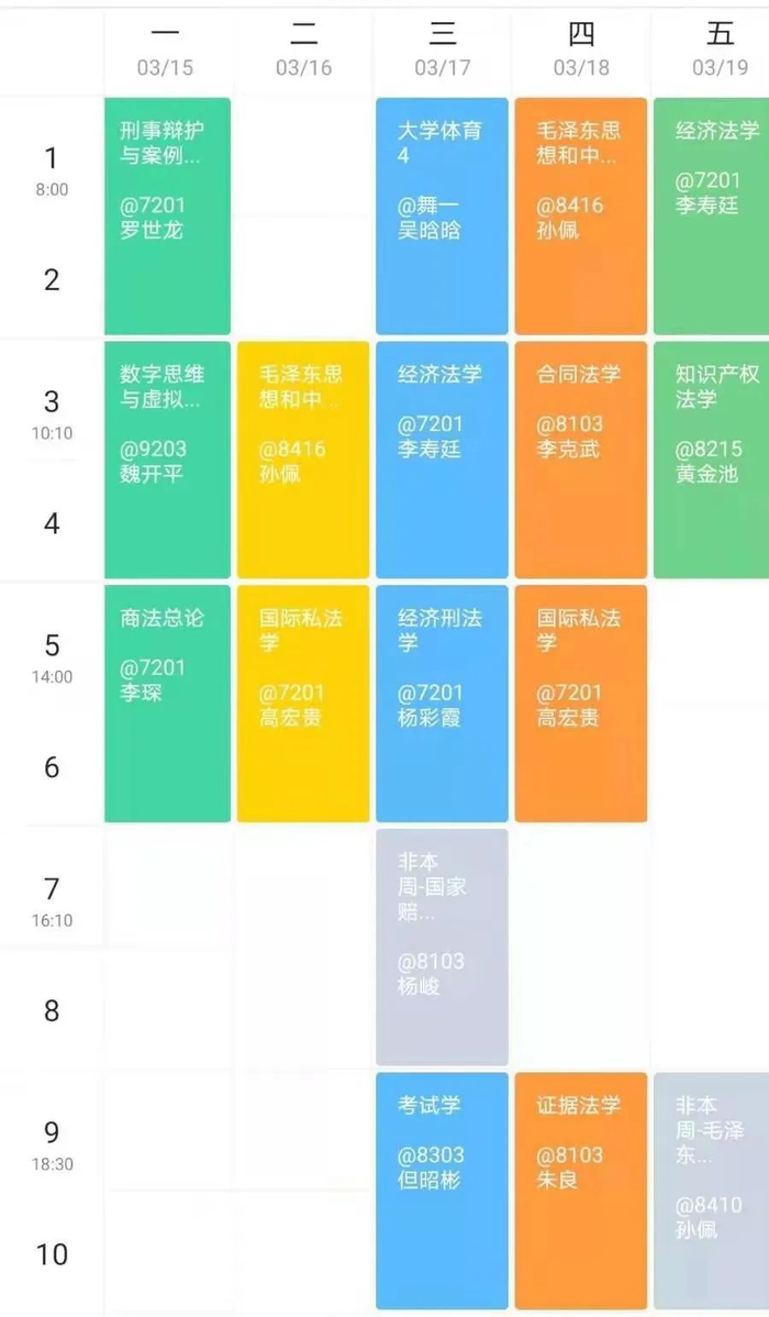 这个学期最明显的感受就是专业课变多了,所以即使今年不用上英语课了,但整个课程安排并没有变轻松,反而因为脑子要负荷更多形形色色的法条了,所以感觉每天的时间更加不够用了。其实被早八“支配”着有个好处就是让我的生活作息更加规律,早睡早起实在是提高效率的法宝!法学是一门很丰富的学科,这是本学期选了好多门专选后的直观体会。不同部门法之间有很大的区别但又似乎有着某种联系,偶尔还能听到不同老师的观点“隔空对峙”,很有意思,法学逻辑大概就是在这样一次次的思维碰撞中建立起来的吧!