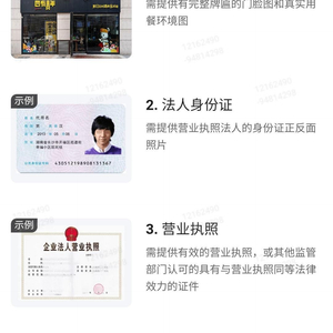 申请人需要准备营业执照、食品经营许可证(餐饮服务许可证)、开店人身份证以及实体店铺照片等四种材料,进行线上审核。