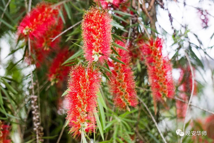校花名片:花开珍奇美艳,无畏与众不同。垂枝红千层花期从春持续至秋,花穗簇生若支支瓶刷子,甚为奇特。她盛放于每年春末夏初,层层叠叠火树红花,满枝吐艳,传递热情奔放的力量。因为她独特的外形与似火的感染力,人们把她的花语定为英姿飒爽、风韵独特。