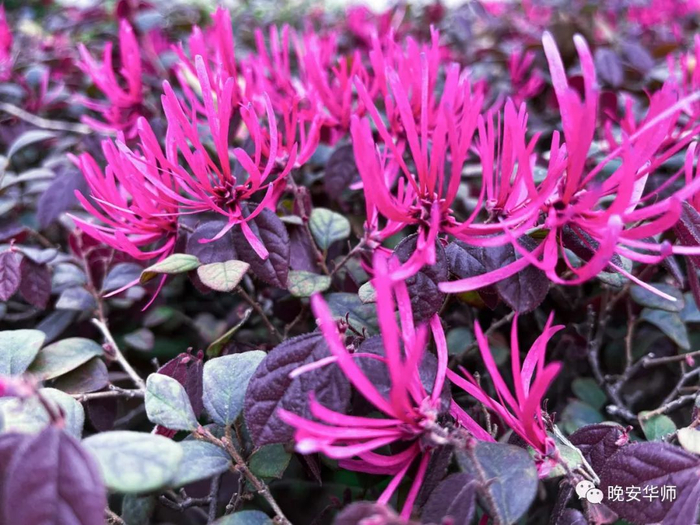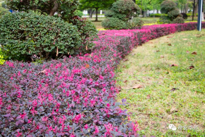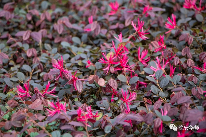 校花名片:檵木初开思杳然,因花造字古来鲜。由花及字,恍然发现“檵”字是象形字,造得实在巧妙,难写的“檵”字,半个方框里四个绞丝,正好对应四条长卷的花瓣,正似一朵红花檵木!红花檵木骨子里透露出来的热烈很难不感染赏花的游人,有花语:红颜如火。