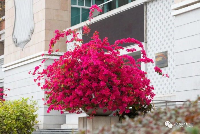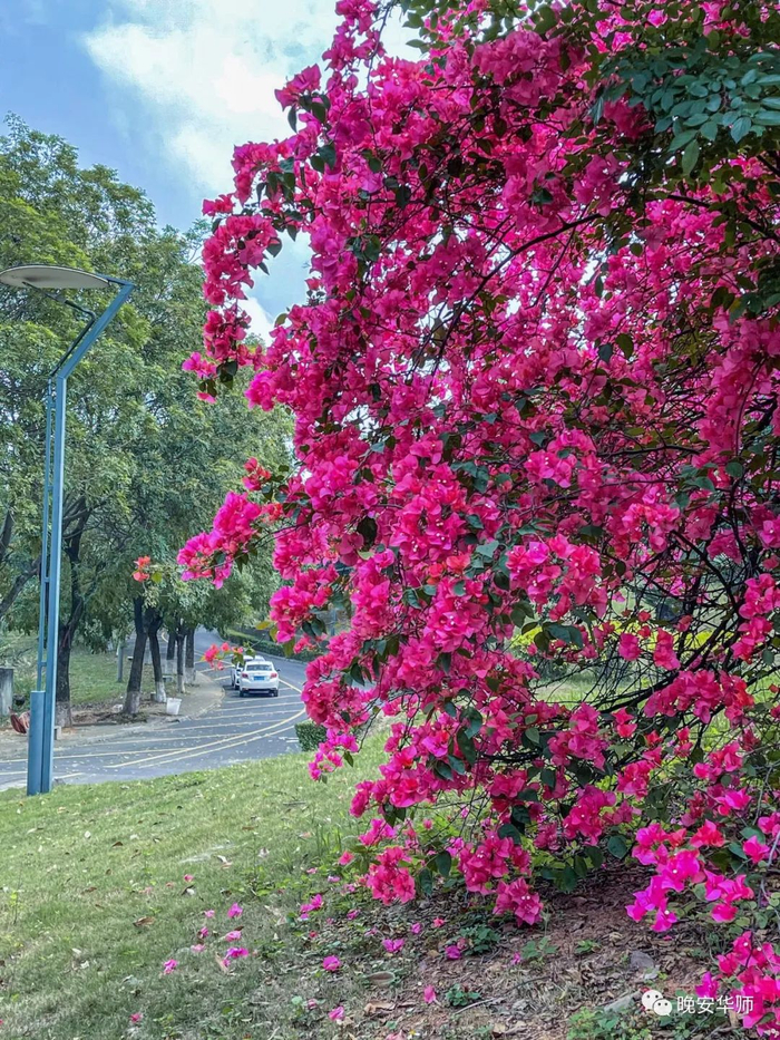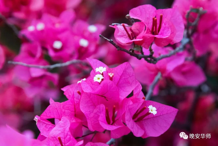 校花名片:冬去春来,大地回温,叶子花向阳生长。姹紫嫣红的苞叶肆意绽放,宛如热烈的花火在燃烧。仔细观察,还能看到苞叶上细微的叶脉纹路;包藏的三朵小白花也渐渐伸展,点缀着灿烂。远观或走进,异彩大放的姿态都引人难忘。正是有着这样饱满的生机力,热情、顽强成为了叶子花的花语。