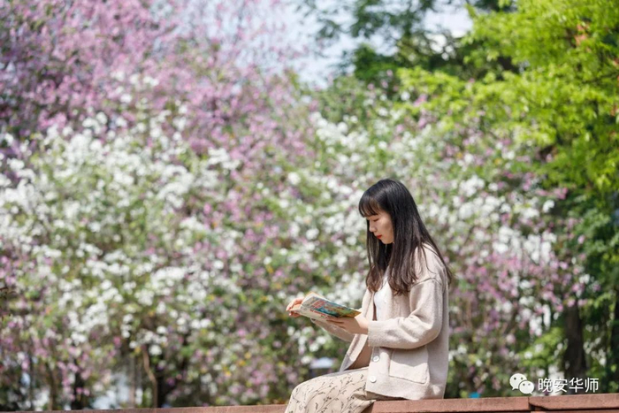 校花名片:一片粉白装点校园,美得惹眼。是谁在空中摇曳着身姿,告诉世人春的到来?是广场上开得绚烂的洋紫荆。浓了春意,也惊艳了行人。热情洋溢,留人驻足拍照欢喜,似在示意:“华师的春天里,有我也有你。”相传,洋紫荆象征着和睦之意,勃勃生机,就好比华师人和谐共进,将青春的美好刻进了记忆里。