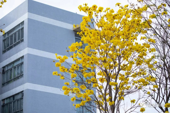 校花名片:一树黄花醉人眼,微风轻抚枝摇曳。黄花风铃木开花时只见花不见叶,团团黄花锦簇,恰似串串风铃,每簇金黄都带来了春天的暖意。她春季开花,夏秋枝繁叶茂,冬季则掉落满地黄叶,一年四季都呈现不同的鲜活样貌,人们都认为她这是在感恩回馈世界,将其花语命名为感谢。