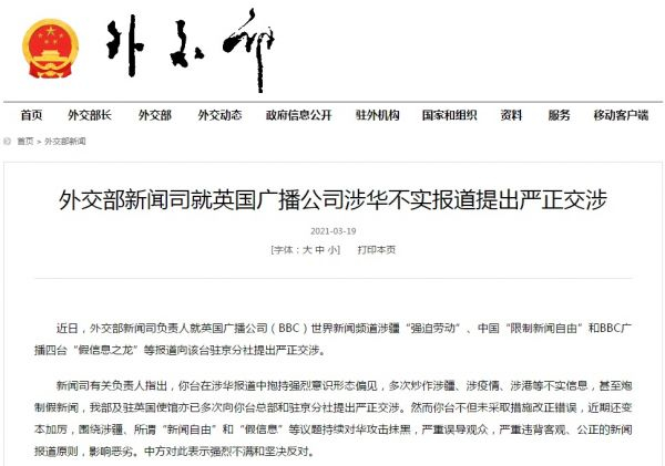 参考消息网3月19日报道 据外交部网站3月19日消息,近日,外交部新闻司负责人就英国广播公司(BBC)世界新闻频道涉疆“强迫劳动”、中国“限制新闻自由”和BBC广播四台“假信息之龙”等报道向该台驻京分社提出严正交涉。