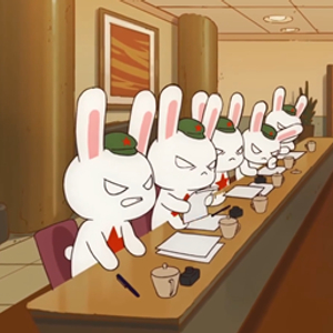 画面左边的兔子,正与画面右边的白头鹰(鹰酱)举行双边会谈,会谈气氛明显相当紧张,与会代表的表情都不太好。