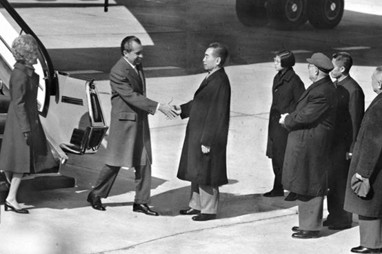 1972年2月21日,尼克松访华,他后来在回忆录中说,为了弥补当年杜勒斯对周恩来的不敬,决定在跨出飞机舷梯时,向周恩来先伸出手。