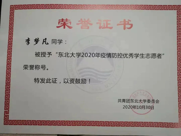 2020年新冠肺炎席卷全球,在别人都居家隔离的时候,李梦凡带上了口罩走出了家门,义无反顾地投入到疫情防控工作中,成为北古底村疫情防控联控志愿者的一员,负责村民进出登记、消毒、体温检测等工作。由于村口没有办公室,只能在室外工作。零下十几度的天气,寒风刺骨呵气成霜,一站就是一整天。尽管如此,李梦凡依旧每天走向村口,拿起体温计,坚守自己的岗位。就这样在病毒和严寒的考验下,李梦凡坚持了22天共计132个小时,直至开学前夕。