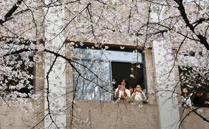 教室的几扇窗户,被樱花争先恐后地“抢占”了,犹如几幅唯美的壁纸,点缀了课堂。