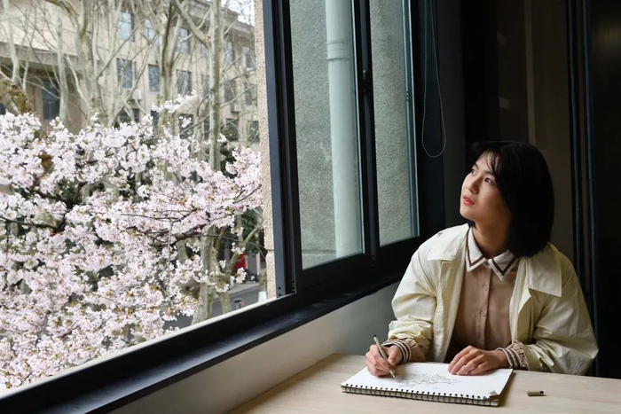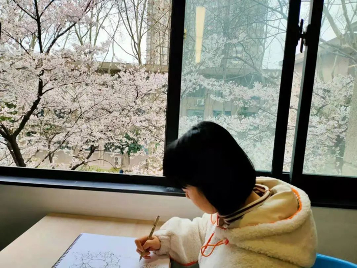 “这间教室可以说是东南大学的‘网红教室’了。还没考进东南大学前,就耳闻'樱花教室'已久,没想到今年开始,可以在这间教室上课和画图,随时都可以来这里学习,朋友们都很羡慕我。”