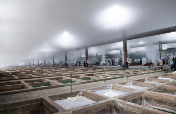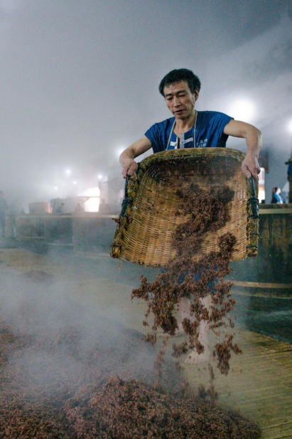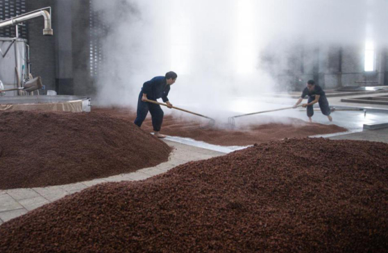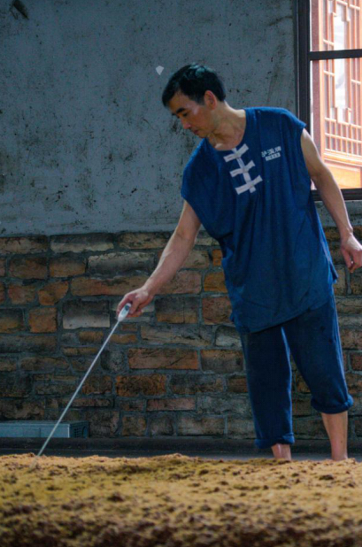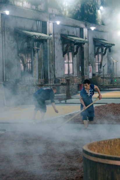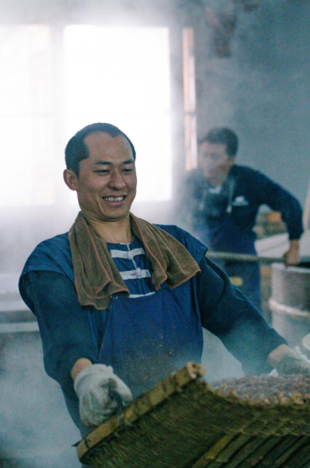 师傅从甑中将熟粮倒出,均匀倒在摊席上