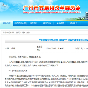 18日,广州市发展和改革委公布了《广州市2021年重点建设项目计划》(以下简称正式项目,)和《广州市2021年重点建设预备项目计划 》(以下简称预备项目)。