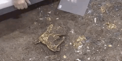 三星堆遗址考古发掘队副领队 四川大学考古文博学院教授 于孟洲:其实当时并不知道它是什么,只知道它是金箔片,因为它褶皱的非常厉害,而且它原本是翻过来放着的,然后除了它之外,旁边还有几片也是比较大的。