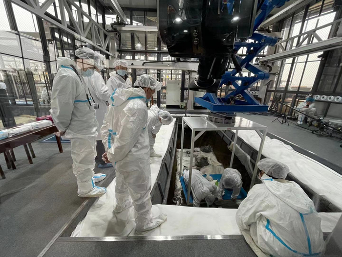 在上世纪八十年代发掘的1号、2号坑旁,新发现的6个祭祀坑被玻璃建造的发掘舱围了起来,考古工作者身着白色隔离服在里面忙碌。部分人员趴在发掘平台上,小心翼翼地清理埋在土壤中的文物。不少清理出来的文物则被包裹起来,放在坑底。